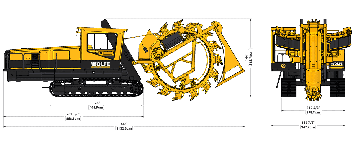 The Wolfe 7000 features a wheel with a maximum trench depth of 7ft. [210cm] and up to 36" [91cm] trench width. The Wolfe 8000 features a wheel with a maximum trench depth of 8 ft. [244cm] and up to 46" [117cm] trench width.